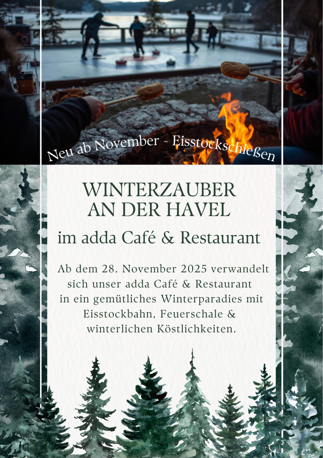 > > ❄️ Winterzauber an der Havel – Gemütliche Wintertage im adda Café & Restaurant > > > > Wenn die Tage kürzer werden und der erste Frost die Havel in ein glitzerndes Wintermeer verwandelt, beginnt im adda Café & Restaurant die schönste Zeit des Jahres: der Winterzauber an der Havel! > > > > Ab dem 28. November 2025 verwandelt sich das adda in ein liebevoll gestaltetes Winterparadies. Freuen Sie sich auf eine Eisstockbahn direkt am Wasser, wärmende Feuerschalen und leckere winterliche Köstlichkeiten, die perfekt zu einem heißen Punsch oder Kakao passen. > > > > Ob mit Freunden, Familie oder Kollegen – hier lässt sich der Winter in vollen Zügen genießen. Besonders neu in diesem Jahr: das Eisstockschießen, das nicht nur für Spaß sorgt, sondern auch den sportlichen Ehrgeiz weckt. > > > > Also, Mütze auf, Handschuhe an und auf zur Havel – der Winterzauber im adda Café & Restaurant wartet auf Sie!